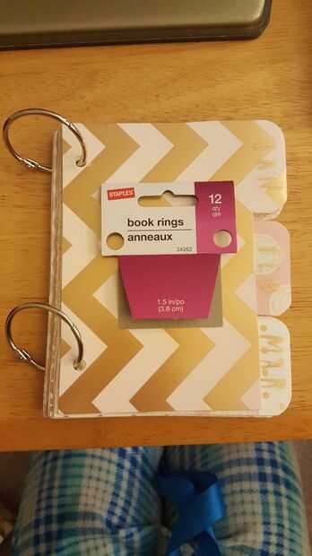 Monte los separadores en los anillos de la carpeta!! Usted puede comprar anillos de la encuadernadora en diferentes tamaños. Estos son anillos de 1.5 pulgadas. Dependiendo de cuántas imágenes que pones en tu libro de chatarra que necesite anillos más grandes. Lo bueno de este libro de recuerdos es que usted puede intercambiar los anillos hacia fuera en cualquier momento para las grandes.