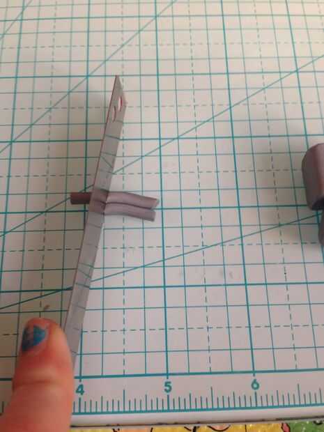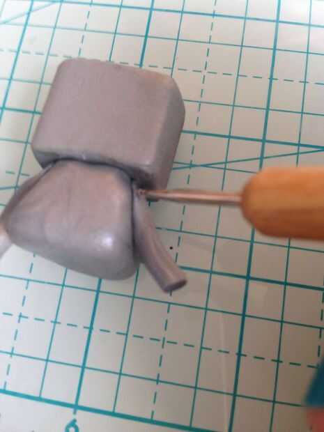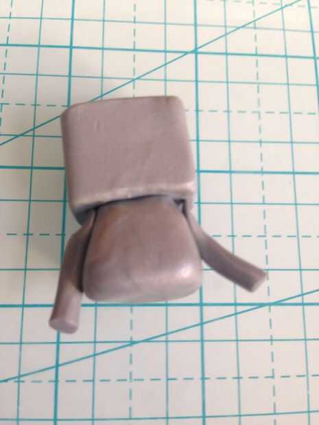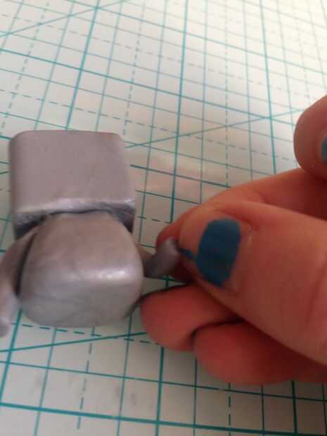 En este paso vas a tener que sacar más plata arcilla. Rodar en una bola y luego rodar hacia fuera en una serpiente mirando lo como en las fotos que se muestra. Cortar los extremos y luego corte una pequeña sección de lo que desea que la longitud del brazo que. Ahora toma uno de sus brazos que cortar y poner al lado de la arcilla adicional. Esto es cómo puede hacer tanto de los brazos del mismo vínculo. Cortar al mismo tiempo. Debe tener dos piezas de arcilla que son exactamente iguales. Ahora les pegan en los extremos del robot como en la imagen que se muestra. Tomar la herramienta o el dedo muere y presionan sobre la sides.do lo mismo para el cargo pero sólo presionan en la parte inferior del robot.