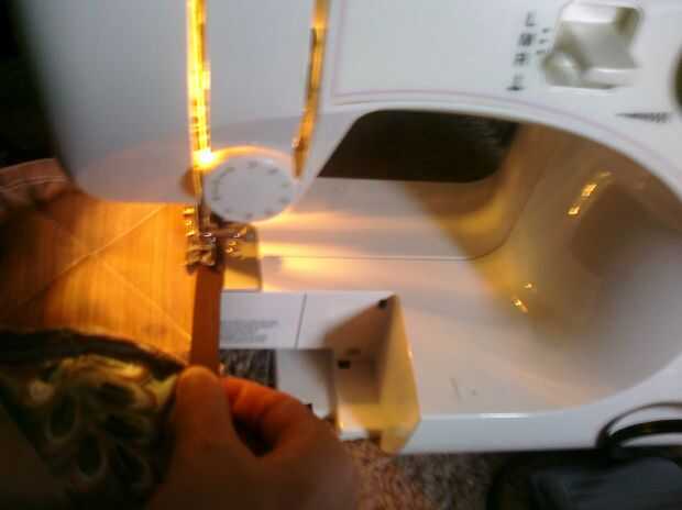 2. Coloque la cinta de bies o tira de tela! Ahora, si quieres ocultar tus puntadas sientan libres desplegar la cinta y coser a lo largo de la pequeña franja derecha contra el borde de la tela. Luego sería doblar la cinta debajo e Hilvanar a lo largo del interior borde de la bolsa. Me ha gustado la línea blanca de mi hilo en la parte superior de mi bolso, así que simplemente cosí la cinta a la parte superior de mi bolsa sin desplegarlo. Hacer mi camino, alinee el pliegue izquierdo de la cinta con los puntos en la apertura de la bolsa. Hacer una puntada recta hasta que ha cubierto completamente el perímetro de la bolsa asegurándose de que se meta en el final. Luego presione la apertura de la bolsa bajo aproximadamente una pulgada.