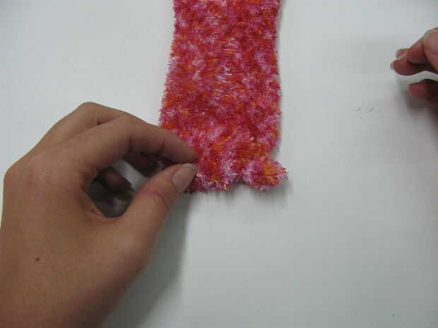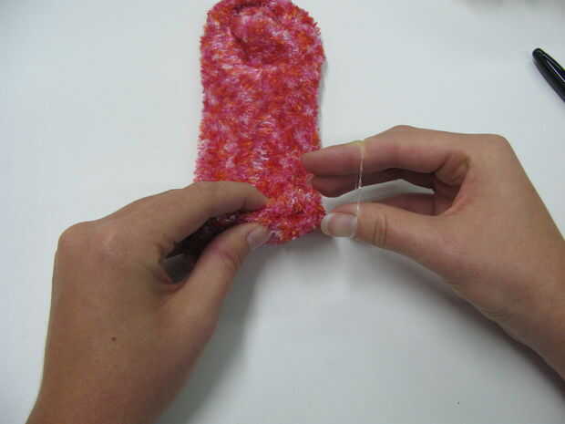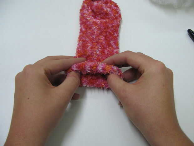 Apriete la esquina del calcetín y usando una banda elástica y ate para hacer un pie. Repita con el otro lado para hacer el segundo pie (Foto 3 y 4).