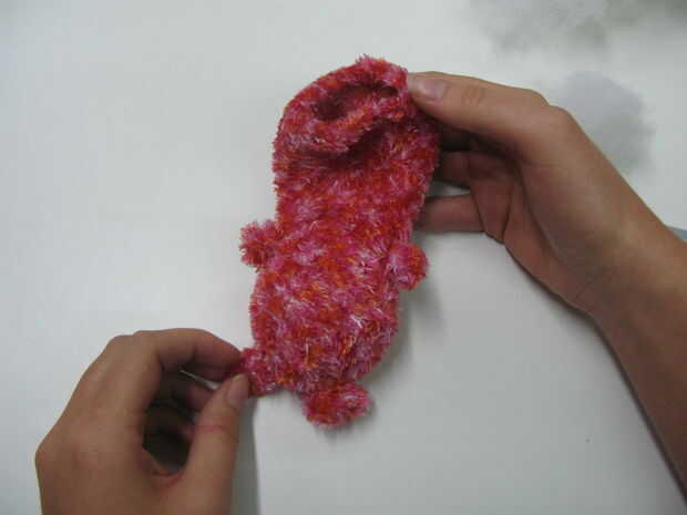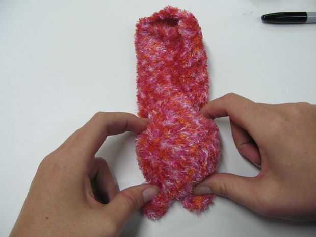 Ahora apriete el calcetín derecho donde el relleno termina y asegurar el sujetador con una banda elástica. Repita con el otro lado, y el bicho tiene ahora las manos! (Foto 2 y 3)
