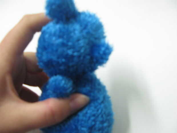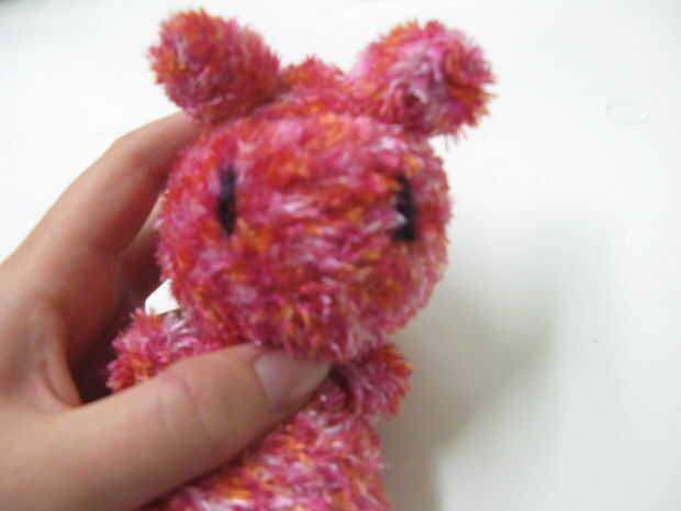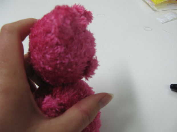 Hacer un cerdo deslizando un botón redondo en la parte frontal de la cabeza, detrás de la tela de la cara y luego deslizarse a una banda de goma alrededor de él dos o tres veces (cuadro 4).
