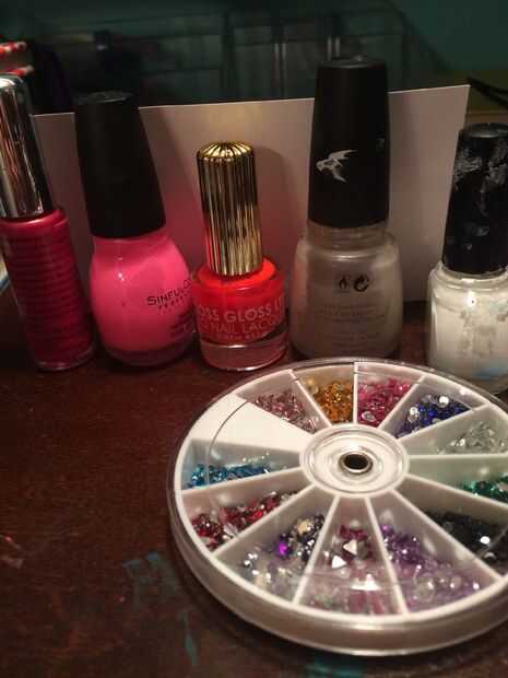 Necesita un rosas 2, claro, negro, naranja, blanco, un cepillo de uñas pequeñas y algunas gemas uñas por este tutorial. Las gemas son completamente opcionales.