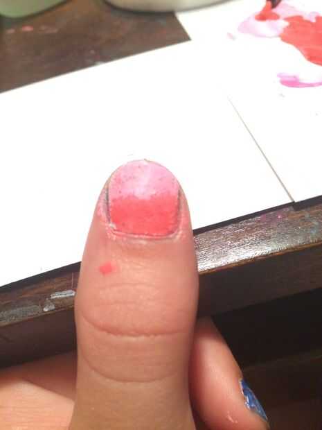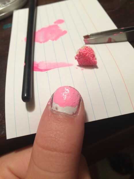 Tome su color rosa y aplicar esto a un trozo pequeño de espuma. Puede utilizar pinzas para extraerlo. DAB el pedazo pequeño en su pulimento. DAB en uñas. Esta 3/4 de la manera encima de la uña lo mismo con orange