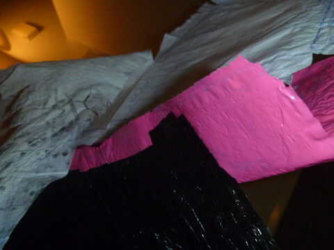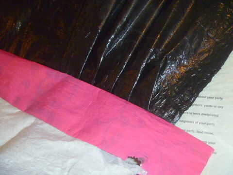 hecha de tiras de bolsa de plástico tiradoPaso 1: Se necesita... 1 par de tijeras3 bolsas de plástico negro (bolsas de la tienda de licor)1 superficie capaz de perno grande (yo usé una forma de vestido)1 caja de alfileresPaso 2: Cortar la bolsa 1. co