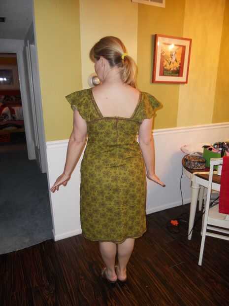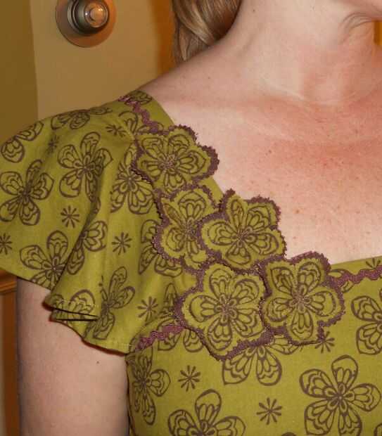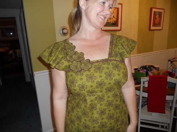 El vestido es simple: una simple banda lanzada a través de la parte superior y una falda-vestido de noche. He añadido una alboroto de la manga a la correa de hombro ancho 1". Luego adornado con cinta marrón en la parte superior, sobre los hombros y en el dobladillo de la parte inferior (no abusar!). Para la diversión real girly, he añadido unas flores corte de sobrantes con tijeras de zig-zag y cosido en algunos ropa de desecho marrón. Entonces lo arreglaron "estilo ramillete".