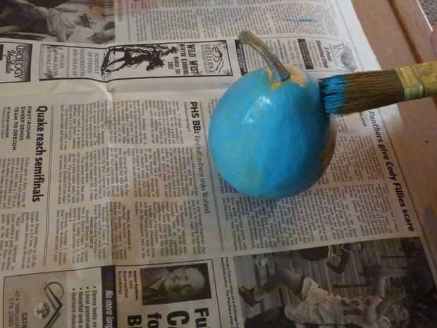 Lo primero que tienes que hacer es pintar tu calabaza secada de la manzana. Si usted tiene la opción de pintarlo de un color claro. Quitar el tallo. Terminada pintura dejar secar la pintura.
