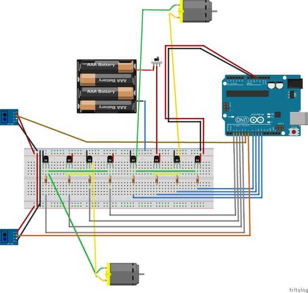 void setup() { pinMode(dxg,OUTPUT); pinMode(dxb,OUTPUT); pinMode(dxv,OUTPUT); pinMode(dxr,OUTPUT); pinMode(sxg,OUTPUT); pinMode(sxv,OUTPUT); pinMode(sxb,OUTPUT); pinMode(sxr,OUTPUT); pinMode(6,INPUT); pinMode(7,INPUT); } void loop() { // dynamic line follower code int lsensor=digitalRead(6); int rsensor=digitalRead(7); if((lsensor==LOW)&&(rsensor==LOW)) { //both sensors on white // go forward digitalWrite(dxg,HIGH); digitalWrite(dxb,HIGH); digitalWrite(dxv,LOW); digitalWrite(dxr,LOW); digitalWrite(sxg,HIGH); digitalWrite(sxv,HIGH); digitalWrite(sxb,LOW); digitalWrite(sxr,LOW); } else if((lsensor==HIGH)&& (rsensor==LOW)) { //right sensor on black line // turn right digitalWrite(dxg,LOW); digitalWrite(dxb,LOW); digitalWrite(dxv,HIGH); digitalWrite(dxr,HIGH); digitalWrite(sxg,HIGH); digitalWrite(sxv,HIGH); digitalWrite(sxb,LOW); digitalWrite(sxr,LOW); } else if((lsensor==LOW)&&(rsensor==HIGH)) { //left sensor on black line // turn left digitalWrite(dxg,HIGH); digitalWrite(dxb,HIGH); digitalWrite(dxv,LOW); digitalWrite(dxr,LOW); digitalWrite(sxg,LOW); digitalWrite(sxv,LOW); digitalWrite(sxb,HIGH); digitalWrite(sxr,HIGH); } else { digitalWrite(dxg,LOW); digitalWrite(dxb,LOW); digitalWrite(dxv,LOW); digitalWrite(dxr,LOW); digitalWrite(sxg,LOW); digitalWrite(sxv,LOW); digitalWrite(sxb,LOW); digitalWrite(sxr,LOW); } }