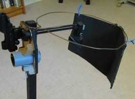 En un telescopio sin un tubo, debe ser una pantalla detrás del espejo secundario, frente al mecanismo de enfoque, que es básicamente como una porción del tubo que falta. Pensé largo y tendido sobre varios diseños complejos. Y entonces me fui para que no se ven muy bien, pero es muy barato, ligero y transportable. Yo deformado una percha así todavía tenía un gancho pero la parte principal se convirtió en un círculo. Colgué algunos doblado (y conducto grabado juntos en el centro) 1/4 tablero de la espuma de él con lazos de alambre. Tenía un agujero extra en la parte superior de la costilla de una decisión de diseño que he cambiado mi mente sobre. El gancho de la percha va en el agujero de la parte superior de la percha se encuentra en la parte superior de la Junta de enfoque y luego cuelga el tablero de la espuma.