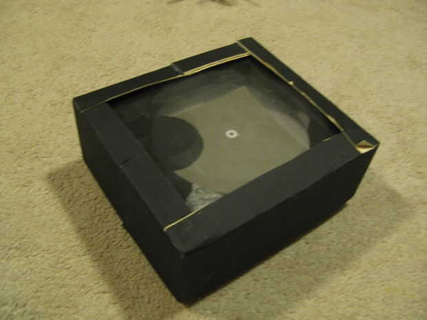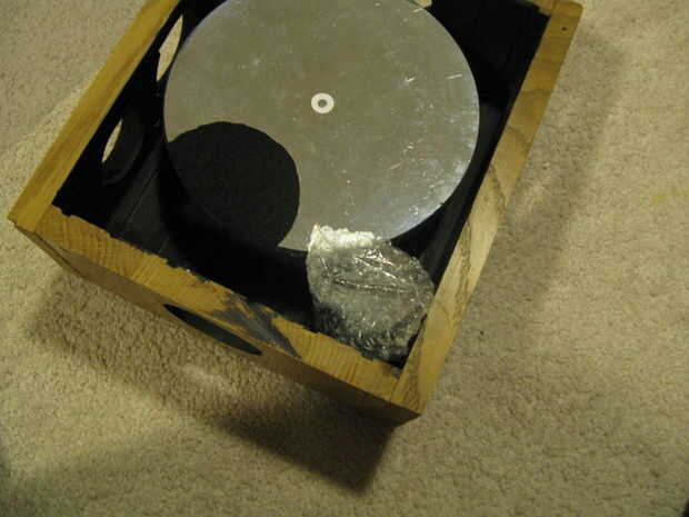 Como paso final, perforé un agujero extra en la placa base de la caja del espejo cerca de una esquina, por lo que yo puedo perno de montaje del secundario, con secundaria, dentro de la caja del espejo (con la perilla en la parte inferior) para el viaje. En la segunda foto, el secundario es el objeto envuelto burbuja en la esquina de la caja.