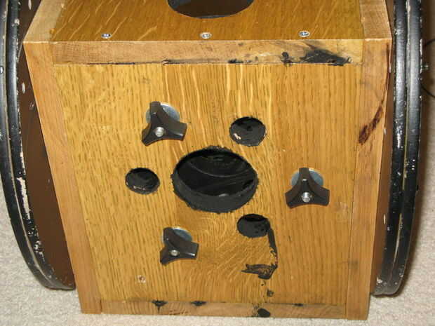 La última foto muestra la parte inferior de la caja del espejo terminado, con tres orificios de ventilación, así como las tuercas de mariposa agradable sobre el transporte pernos que se pega fuera de la caja. Hay, por supuesto, las arandelas de defensa entre las tuercas de mariposa y la madera.