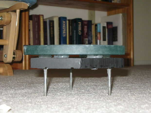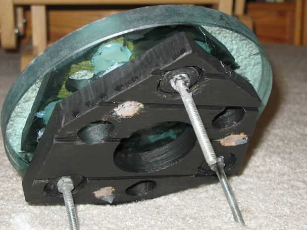 Para pegar el espejo a la celda, la idea es poner 1/2 gops gruesa de pegamento de silicona en la celda para que cuando es aplastados por el peso del espejo, se extenderá en 1" de ancho y 1/4" espesor discos (ver la foto de la vista de lado). Los montones fueron a la distancia correcta del centro (calculado por Plop) y fueron entre que los seis previamente agujeros perforaron en la célula (los tres orificios de ventilación de 1.25" y los tres 1/4" cabeza fresada carro agujeros de perno). Sin embargo, para seguridad adicional, taladré orificios 1/4" en la celda donde iría cada gob y hace que cada gob penetró a través del agujero y al otro lado de la célula. Mantener cada gob de separar de la célula. No hay ninguna preocupación similar sobre el lado del vidrio porque buena silicona (utiliza el pegamento de silicona transparente de olor estándar DAP; simplemente no utiliza la menos apestoso II de silicona ya que hay malos rumores acerca de) se adhieren muy bien al vidrio.
