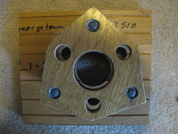 Entre los tres 1.25" agujeros de ventilación en la célula, después de avellanar con la espada de 1.25" de bits, perforé 1/4" agujeros para los pernos de carruaje que se salen de la célula, a través de la célula y la placa de fondo de la caja de espejo.