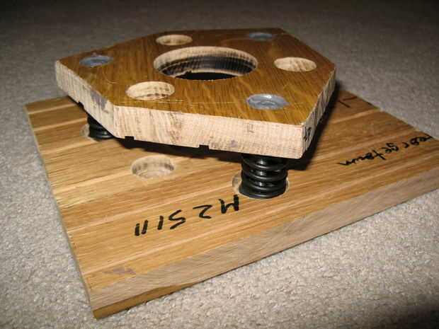 El avellanado se realiza en tres lugares: en la parte superior de la placa inferior y en la parte inferior lateral del espejo hexagonal de la célula para mantener los resortes en lugar como en la foto, y en la parte superior del espejo celular a las cabezas del carro pernos pulgadas (porque brocas de pala son guiados por su centro es una muy buena idea para avellanar antes de perforar los agujeros de 1/4".) Avellanar en ambos lados se debilita la célula, pero con la madera muy dura que estaba usando, yo no estaba preocupado.