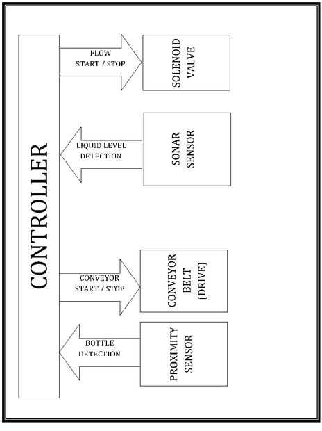 El objetivo del proyecto es detectar la presencia de una botella de cristal en la estación de servicio, llenar el líquido de la botella a cierta altura y hacia delante de la botella para su posterior procesamiento. El proyecto consiste en una cinta transportadora, para el llenado de botellas a un determinado nivel de líquido, impulsado por un motor de DC a una velocidad preajustada constante. El motor va seguir conduciendo el transportador hasta que un sensor de infrarrojos (IR) detecta la presencia de un derecho de la botella por debajo de la estación de servicio. El sensor de infrarrojos envía la señal al controlador que a cambio envía una señal de que el motor se detenga. Tan pronto como se detiene el transportador, el actuador para el relleno, es decir, una válvula de solenoide, enciende el relleno. El nivel de líquido en la botella continuamente se monitorea utilizando un sensor de ultrasonidos. Un preset requerido nivel del líquido ya se introduce en el controlador. El controlador compara el nivel instantáneo de los niveles prefijados de requerido. Tan pronto como se alcanza el nivel deseado, la válvula solenoide se desactiva el relleno. Cuando se detiene, el transportador empiece a funcionar móvil por lo que puede llenar la siguiente botella.