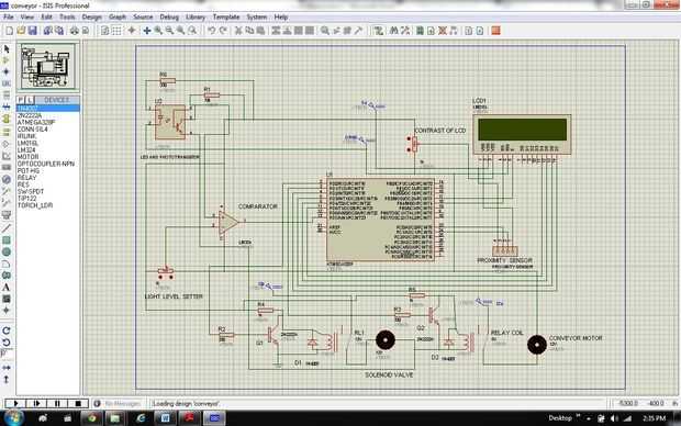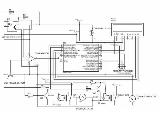 El circuito está provisto de dos diferentes fuentes de energía (dos baterías de 9 voltios) y una de 12v 2.0amp fuente. Hay dos interruptores que se convertirá en el circuito. Cuando el vaso se coloca en la cinta transportadora, cuando se trata entre el LED y el fototransistor, la señal de salida se generará por un comparador, que tiene un valor prefijado por un potenciómetro contra la sensibilidad de la luz recibida por el fototransistor. Esta salida es entonces lee por un 8 bit 32KB Microcontrolador AVR (ATMEGA 328) que inmediatamente se detiene el transportador y transmitirla a través de se encenderá la electroválvula y por lo tanto, el líquido fluirá a través de él por la acción de la gravedad en el vaso a través de la válvula del depósito. El sensor ultrasónico detectará el nivel de agua, siguiendo el Doppler fenómenos, el valor del nivel se establece experimentalmente en la programación. Cuando se alcanza el nivel del líquido el controlador después de tomar la decisión de desconectar la electroválvula y encienda el transportador y le peso para el otro vaso a.
