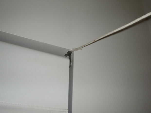 Aquí está una foto de la primera línea ponga para arriba, originalmente fue pensada para complementar a una carga de ropa que había sido secada una vez ya (nuestros secaderos son bastante terribles). Al final de la Cátedra fue unida con la línea de ropa más que corrió por el lado del armario y fue cargada abajo. El extremo de la cuerda también fue tirado por debajo el armario.