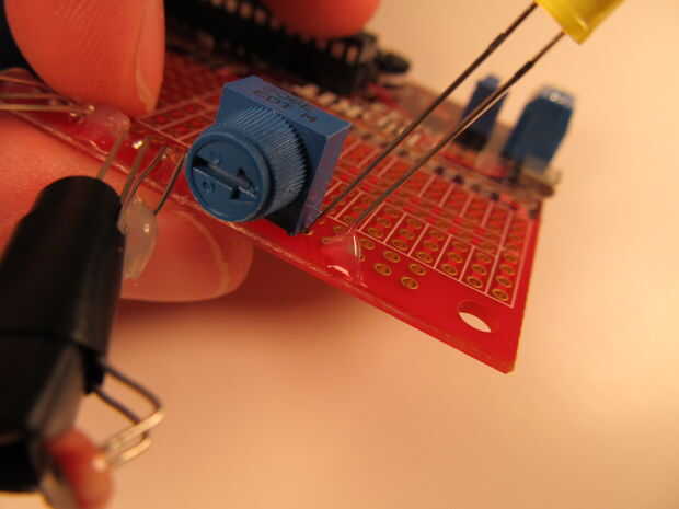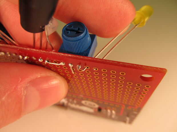 1. Poner las puntas de los cables de su LED a través de la placa, en la parte exterior de una de sus ollas. Mantenga el cátodo (el cable más corto) hacia el exterior e incline el LED para que ambos conductores apenas palillo a través de la Junta.