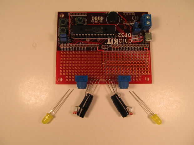 Este paso es opcional ya que estos LEDs son puramente estéticos. Utilizará su segundo conjunto de LEDs, su DP32 y tu soldador. También puede utilizar la pistola de pegamento caliente aquí para ayudar a mantener los componentes en su lugar.