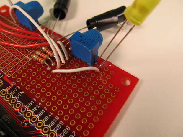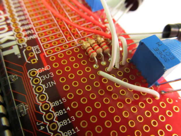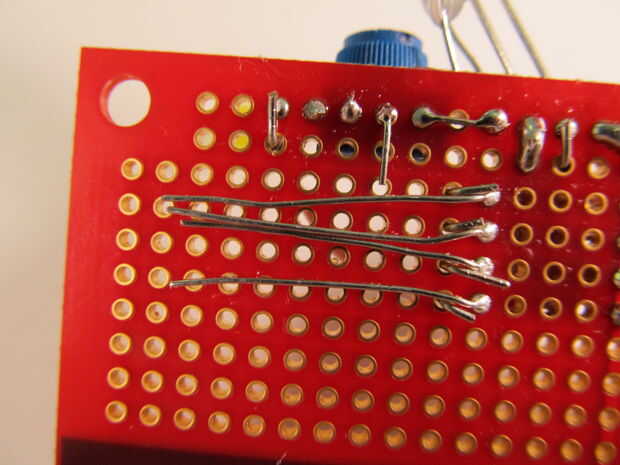 1. Fotos 1 a 5 muestran donde deben conectarse los cables. Básicamente todos los que haces se conecta el cátodo (el plazo de ejecución corto) de cada LED con una resistencia. No importa que resistencia se conecta a cual LED, pero se debe intentar que sea aseada y organizada para no enredar a los cables.