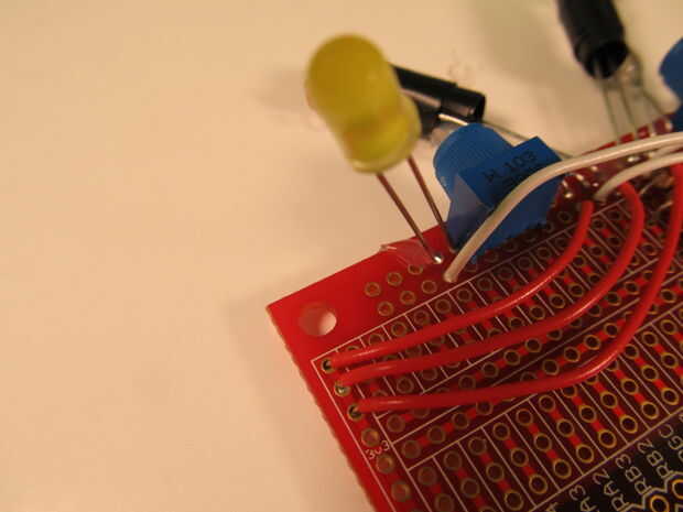 2. Doblar tus cables para que los cables no resbalen hacia fuera. En el cuadro 6, os muestro cómo estoy tocando las puntas de mis cables a los cables de mis resistencias, y en cuadro 7 te muestro como toco mi alambre conduce al cátodo del LED de mi.