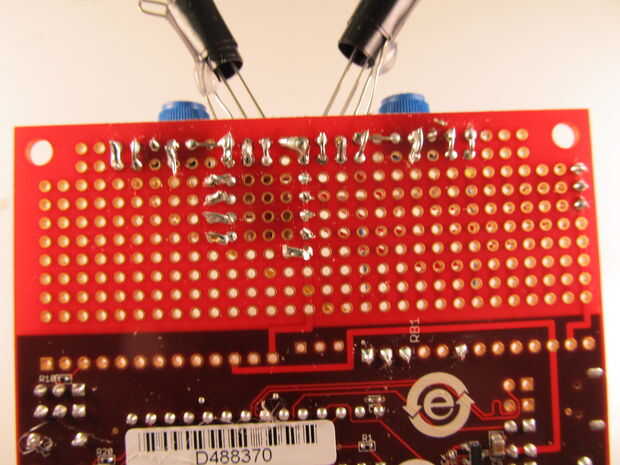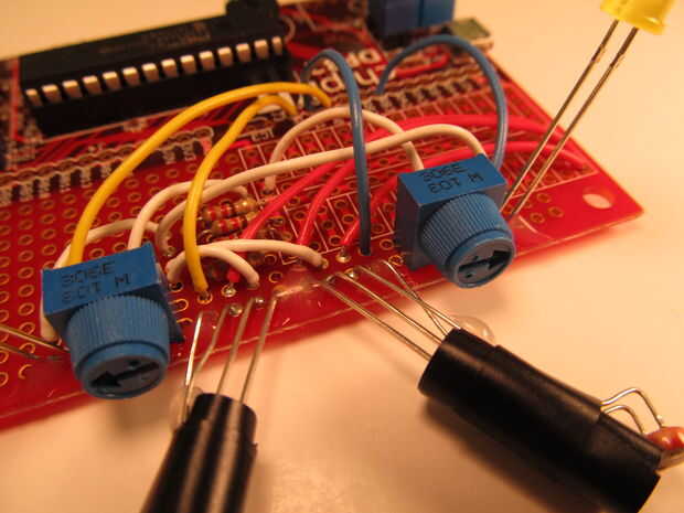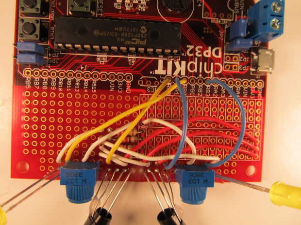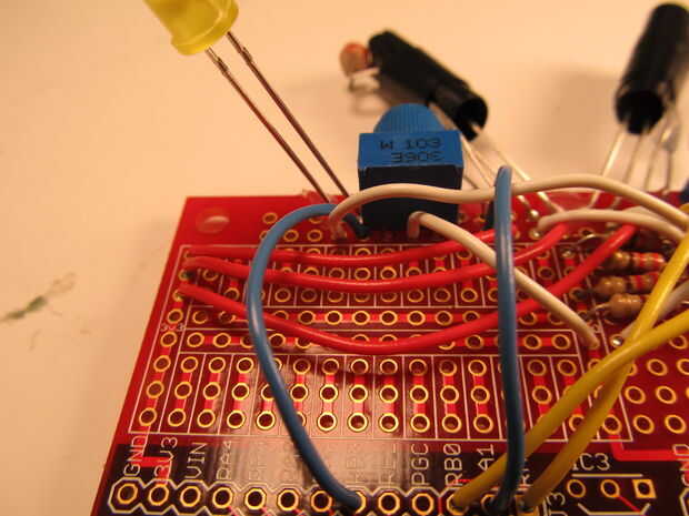 1. Fotos 1 a 3 muestran donde deben conectar estos cables. Uno conecta el ánodo de la izquierda LED al pin 14 (etiquetado RB3) y la otra conectará su fotocélula al pin 10 (etiquetado RA1).