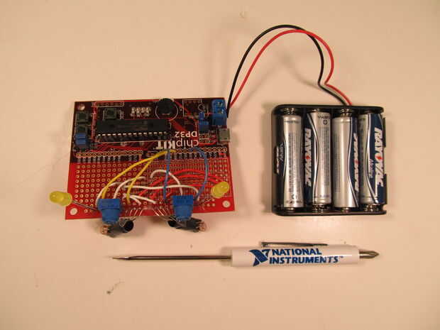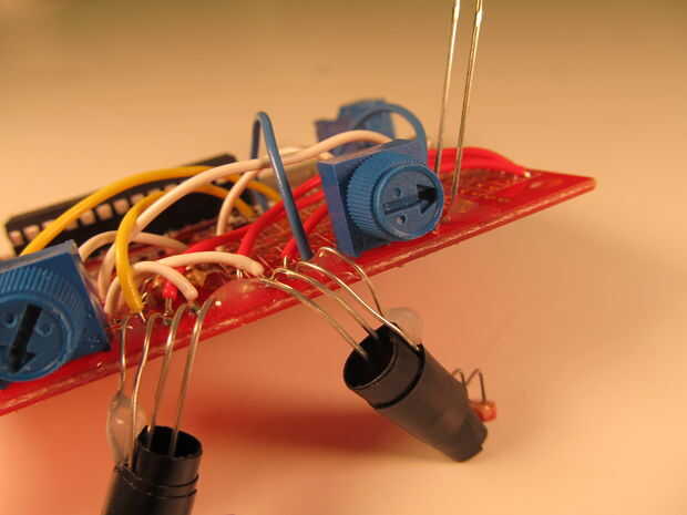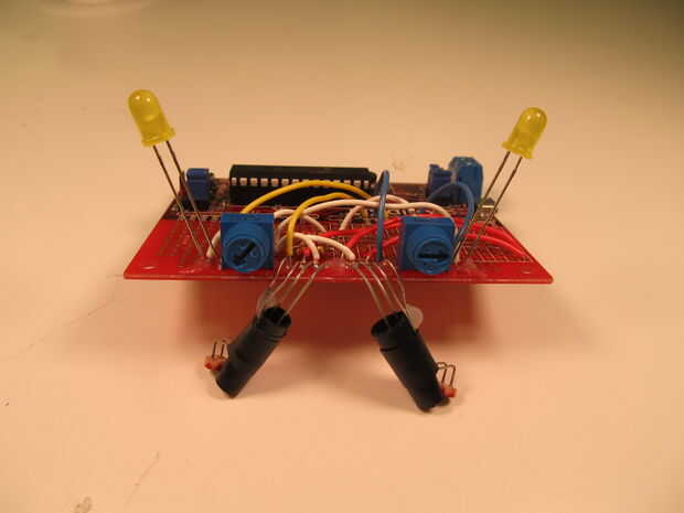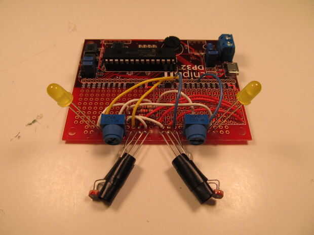 Ahora que todo ha sido soldado en, podemos doblar nuestros sensores hacia abajo, como en los cuadros 2 y 3. Tenga cuidado, cuando usted dobla sus sensores, que no dejó de tocar cables.