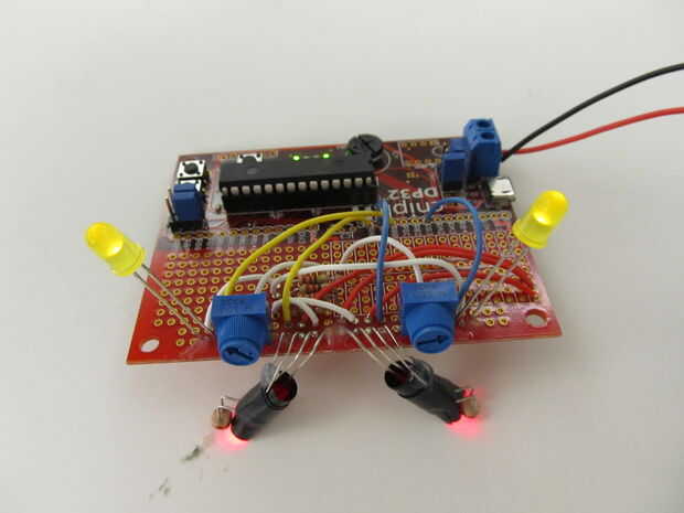 Para cada sensor, realmente tenemos tres circuitos en paralelo casi completamente separados (y por supuesto tenemos dos sensores, así que dos conjuntos de tres circuitos). Primero hay el circuito que conectado mi LED rojo, luego uno mi fotocélulas están conectadas a, y por último el circuito de mi LED amarillos está conectado a.