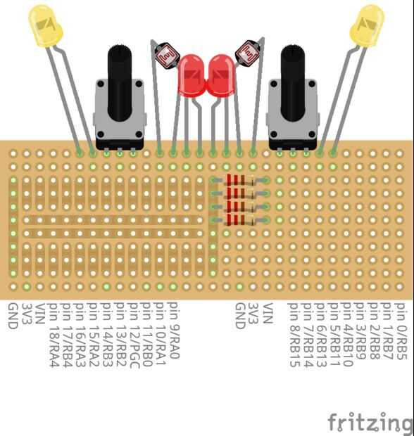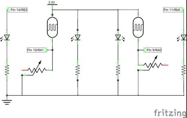 Por último, Permítanme explicar cómo funciona el circuito de la fotocélula. Esto también comienza con una conexión a nuestro 3 regulado línea de voltios. La fotocélula sí mismo actúa como una resistencia, con resistencia variable basada en cuánto luz golpea. Más luz, menos la resistencia. Entonces, en vez de conexión a tierra a través de una resistencia normal, corremos a través de otro resistor variable llamado un potenciómetro, o una maceta para el cortocircuito. Girando el dial de la olla, podemos cambiar su resistencia. Con estas dos resistencias en serie (la fotocélula y el bote) variamos qué voltaje está siendo aplicado al pin 9. PIN 9 es especial (mismo con el pin 10) porque puede ser utilizado para medir el voltaje que se aplica a él. Es cómo nuestro tablero puede saber si está mirando algo ligero o algo oscuro! ¿Limpio, correcto?