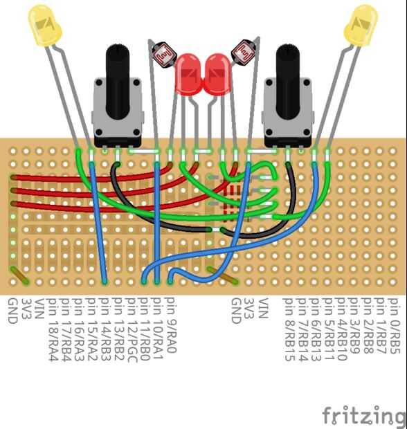 Que he proporcionado dos imágenes para el diseño, uno con cables y sin, porque es más difícil tratar de averiguar exactamente donde todo se pone con todos eso espaguetis de la manera. También me gustaría señalar que, mientras que Fritzing permite aplicar cableado de superficie a breadboards, no tiene una buena forma de mostrar las conexiones de soldadura en el otro lado de la protoboard. Con esto en mente, he añadido cables blancos a mi diseño para mostrar cómo las cosas están conectadas en el otro lado de la Junta. Por último, para mayor claridad, he coloreado mi señal azul, los cables de tierra que van a través de un resistor son verdes y luego las líneas de tierra y alimentación directa de los cables rojo y negro respectivamente.
