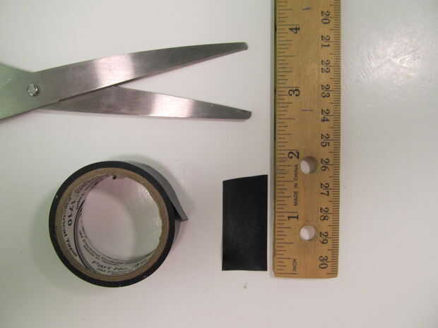 - Use sus tijeras para cortar una tira de cinta aislante que es cerca de 1 pulgada (o 3,5 cm) largo. Prefiero hacer mi cinta para este paso en vez de lagrimeo ya que deja un borde mucho más limpia.