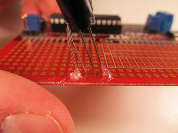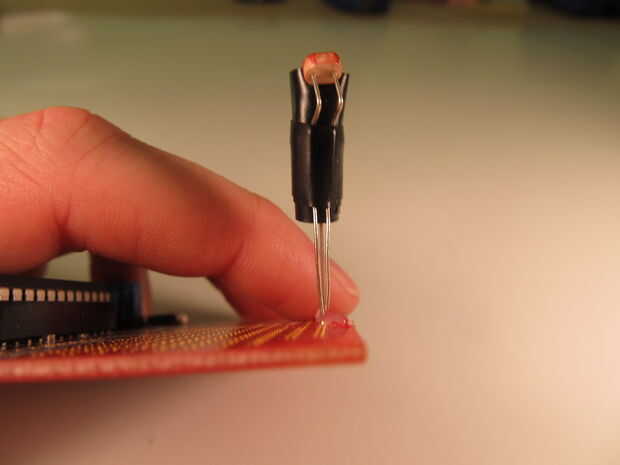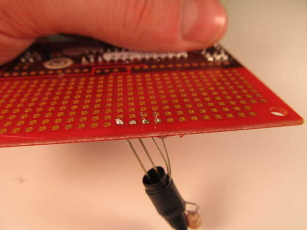 3. Me resulta difícil mantener mis partes como esta mientras estoy de soldadura, así que mucho cuidado añadido dos gotas de pegamento caliente para mi lleva a la mantener mi sensor en su lugar. Mantenía la cola al borde exterior de la Junta, para que no se conecte a cualquiera de los orificios.