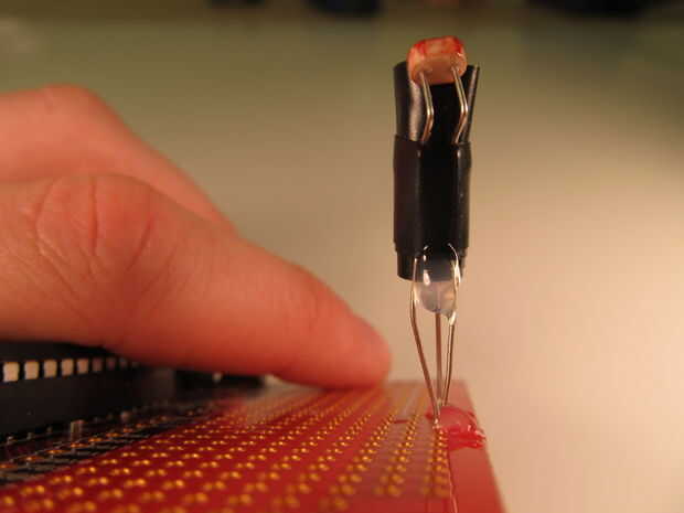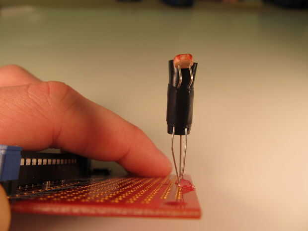 5. Preocupaba que quisiera tocar las puntas de mi fotocélula. En el cuadro 9, puedes ver cómo juntos son, así que había les había doblado aparte un poco con mis pinzas y añade una gota de pegamento caliente entre ellos que se puede ver en el cuadro 11.