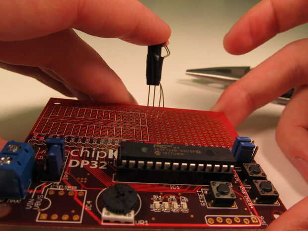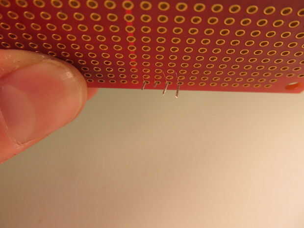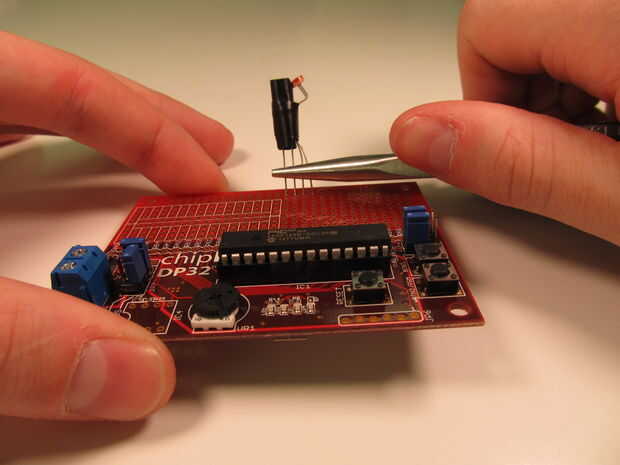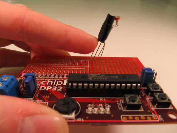 1. Fotos 2 a 4 muestran cómo usar mis alicates para roscar que el sensor lleva a través de los agujeros de la protoboard de DP32. Observe cómo la fotocélula está a la derecha del LED, al lado del cátodo de LED.