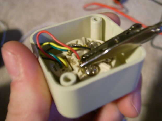 Como antes de ahora nosotros tomamos el otro extremo de esta pinza y clip para el cable rojo en el enchufe del teléfono.
