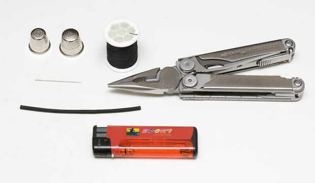 Usé un hilo de nylon fuerte porque me gusta transcurrido las cosas y esto es lo que generalmente uso en cordura, cintas y otros equipos al aire libre. Alicates son para tirar de la aguja a través de al empujar con el dedal no hacerlo (pasar por una pareja capas de cordura y el cable de descarga, por ejemplo). Llama es para terminar el cable de descarga al final de la fusión y lo harían de ese material sintético.