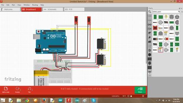 Cualquier línea en el código que tiene un comentario que usted tenga que modificar. Esto sólo sucederá si los puertos que conecta tus sensores QTI y controladores de motor también son diferentes de los puertos que se conectan con en el esquema. Por ejemplo, en mi esquema del izquierda el controlador del motor es conectado al pin 10. Si el tuyo está conectado a un pin diferente que tienes que cambiar los valores de ciertas variables en el código.