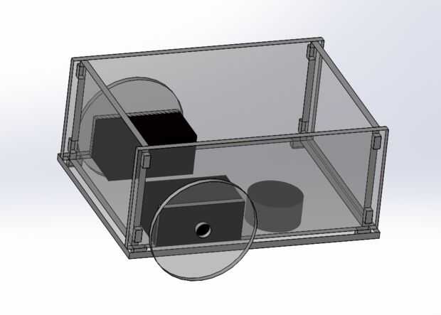 Un simple cuerpo fue diseñado para ser cortado de 1/8 acrílico usando un cortador láser. Esquemas de SolidWorks y vector están disponibles más abajo. El cuerpo del robot fue diseñado alrededor de los componentes que fue requerido para adaptarse, por lo tanto el ancho del cuerpo se determinó en gran medida por el ancho de los servos utilizados para las ruedas, y la longitud fue elegida para montar la placa de Arduino Uno, batería de servo y batería de Arduino. Se decidió utilizar un simple punto fijo para el pivote trasero, en la forma de un 1/4" perno de la cabeza del botón, porque el robot fue diseñado para correr en una superficie plana, dura, que no se anticipó a plantear problemas a un método simple de soporte trasero.
