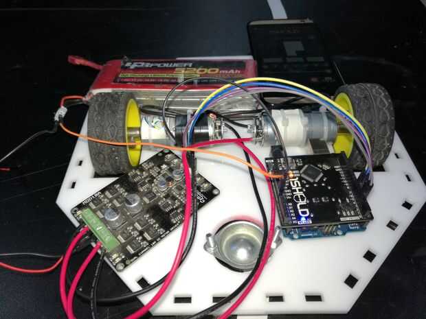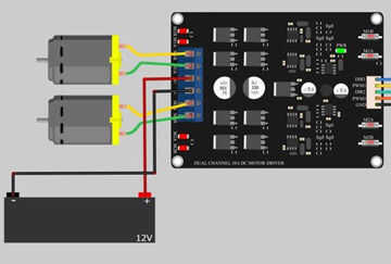 Básicamente, la conexión es muy simple como la conexión de cualquier 2 motores con un buzo motor como se muestra en el esquema anterior. Tenemos para cada canal en el conductor del motor una patillas (PWM) para cambiar la velocidad del motor y (DIR) para cambiar la dirección (CW / CCW).