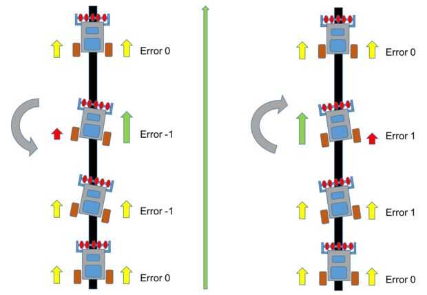 Supongamos que el Robot está funcionando sobre una línea y la salida del Sensor de matriz es: "0 0 1 0 0". El error correspondiente es "0". en esta situación, ambos motores va a correr hacia adelante en una velocidad constante: