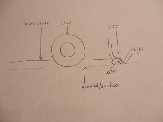 el motor adecuado está conectado en serie con un LDR y un transistor. el LDR se coloca en un ángulo de 45 grados a la superficie y recibe la luz reflejada por esta superficie. Cuando la superficie es de color negra, menos luz se reflejaban sobre la LDR, cuando la superficie es blanca, más luz entra en el LDR.