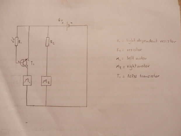la resistencia de la LDR varía dependiendo de la cantidad de luz entrar en él. (varie de LDR mayoría entre 3000 ohms cuando la luz y 10000 + ohmios cuando oscuro) esto significa que la corriente es variada saliendo de la LDR. un transistor se utiliza para el "topetón-para arriba" esta corriente para que sea suficiente para impulsar el motor. por lo tanto el motor de la derecha será "alto" (mucha corriente) cuando en una superficie ligera y una voluntad que se "baja" (no actual) cuando en una superficie oscura. el izquierdo recibe motor que una constante actual permanece siempre en sin embargo está conectado en serie con una resistencia que lo hace gira más lento que el motor adecuado cuando el motor adecuado es "alto". Esto significa que el robot sube en zig-zag a lo largo de una línea negra.