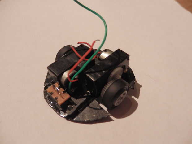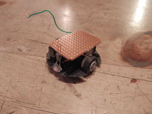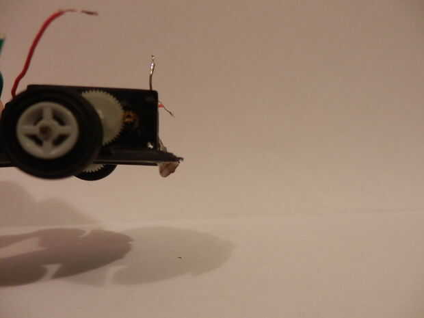 mi placa base es una ronda de pice de plástico recortadas de un recipiente de plástico. cortar ranuras para las ruedas, interruptor y LDR. el motor y los módulos de engranajes simplemente se unen con pegamento caliente junto con el interruptor. el LDR es un poco más complicado ya que tiene que ser montado en un ángulo de 45 grados a la tierra y más sobresalen del thebottom de la base por la misma cantidad que las ruedas ya que también funciona como una rueda de duende para mantener estable el robot. se muestra una foto de cómo mina se colocó en la parte inferior del robot. también decidí cortar un pequeño trozo de PCB para mis componentes en la soldadura. Esto sentó muy bien sobre los montajes de motor.