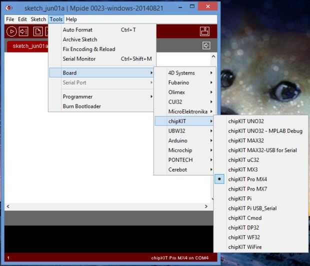 3. En MPIDE, asegúrese de que la Junta seleccionada si el chipKIT MX4 Pro.