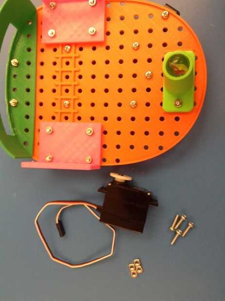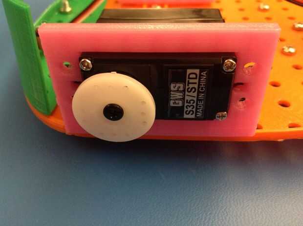 A continuación queremos conectar los servos a los soportes del Servo. Pop el Servo en la plaza con la rueda blanca mirando hacia el exterior y orientado al soporte de sensor.