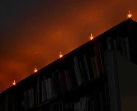 Lo hizo con 6 Bombillas en una fila y ponerlo en mi estantería grande en su parte superior, bajo el techo. El techo blanco refleja la luz anaranjada de fuego abajo y da una muy agradable, tenue que brilla intensamente alrededor. Si tienes cualquier otra idea de la colocación, puede organizar los bulbos en círculo o en un lugar, o de todos modos. Mi arreglo linear es para el shelftop de 2 m largo.