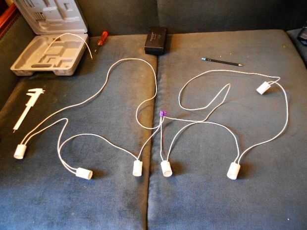 Después de esto, cortar los cables y crear las conexiones de todo el circuito, refiriéndose a los esquemas y las imágenes. El terminal se conecta a los polos 'principales' del circuito, porque el sistema es una lámpara sólo hasta este punto; después de que el cable con un interruptor y el enchufe es una parte móvil, el otra (y no hablo de en este breve instructivo, todo el mundo puede formar después de sus propias necesidades). Pero evita las conexiones débiles, fortalecer firmemente todos ellos.
