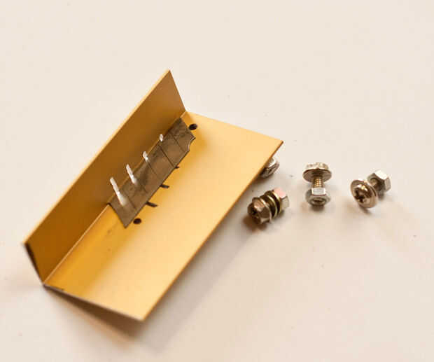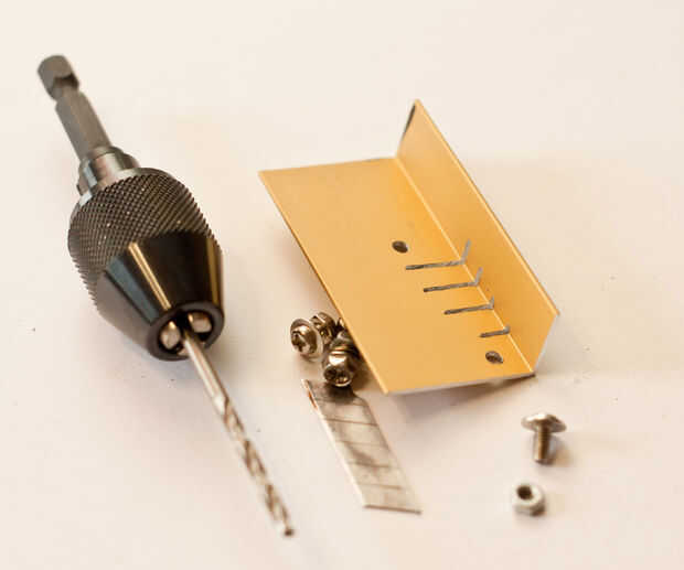 Como hoja utiliza una cuchilla pequeña, pero usted puede decidir usar uno más grande. Coloque la cuchilla contra el borde interno, luego marque los puntos donde taladrar dos orificios para los tornillos. Usé un eje para perforar a mano.