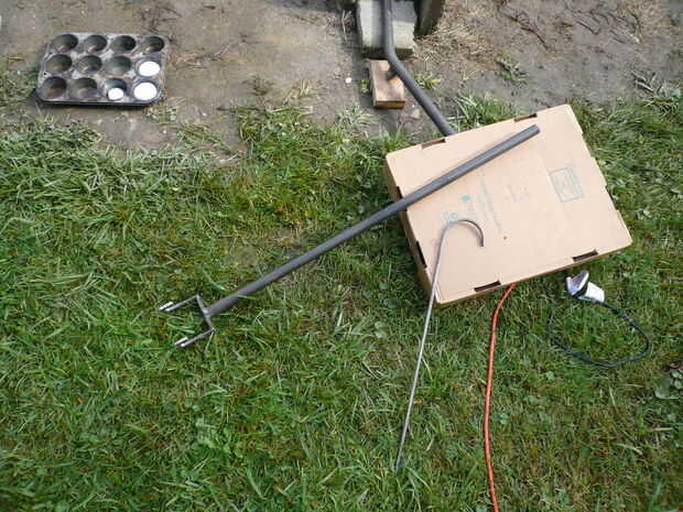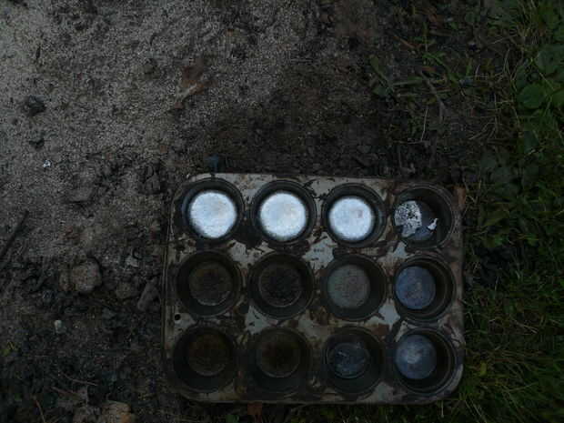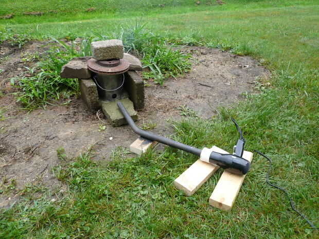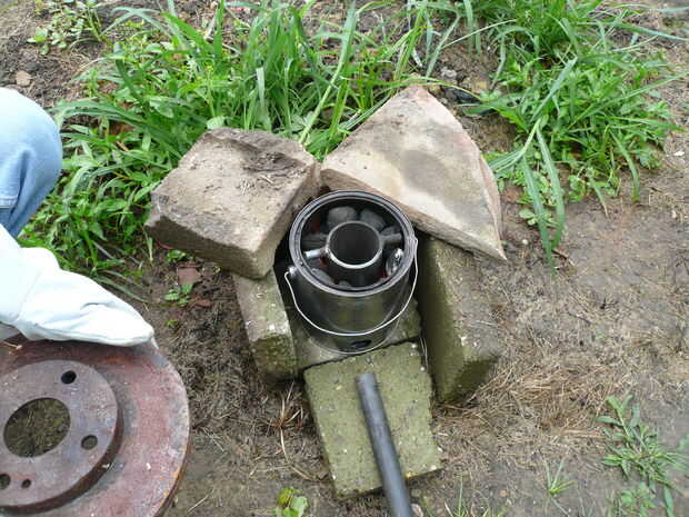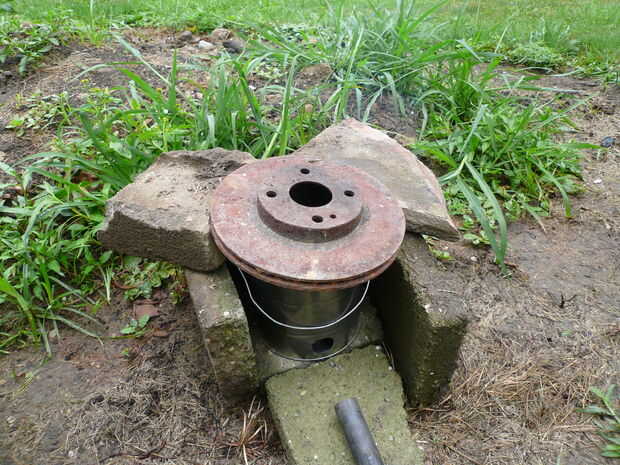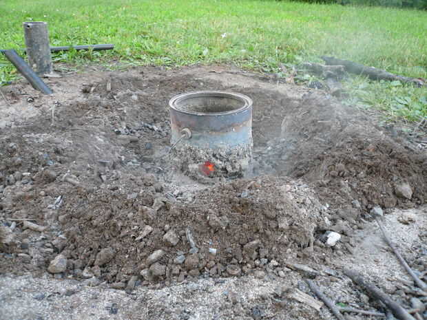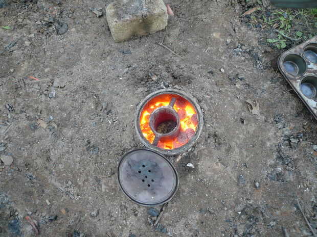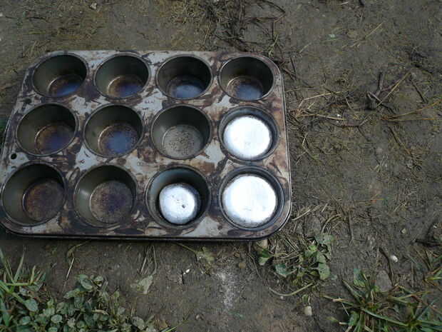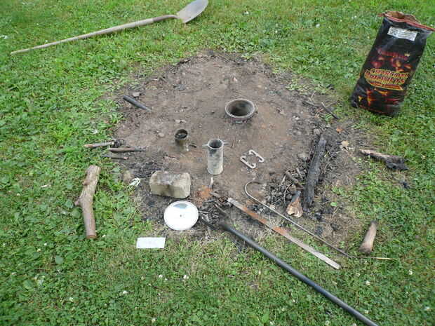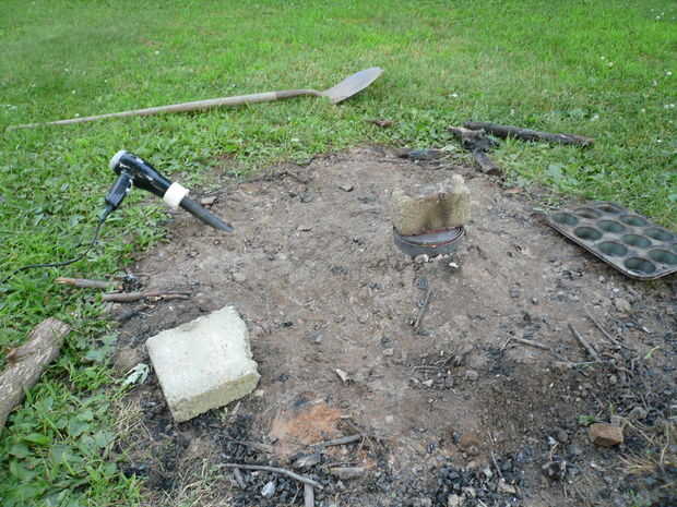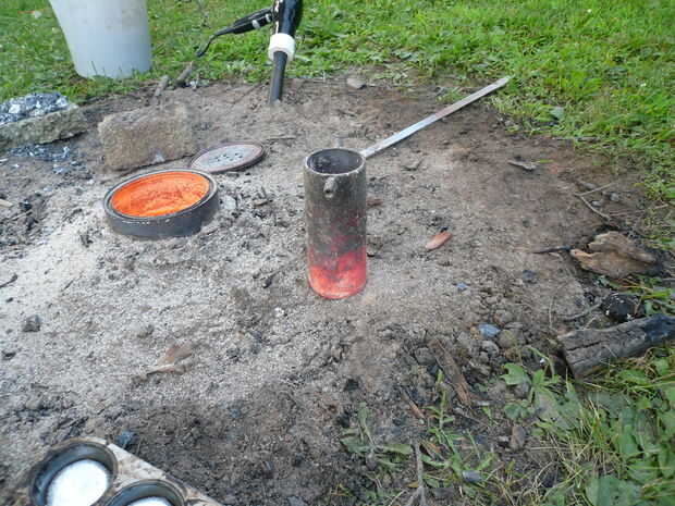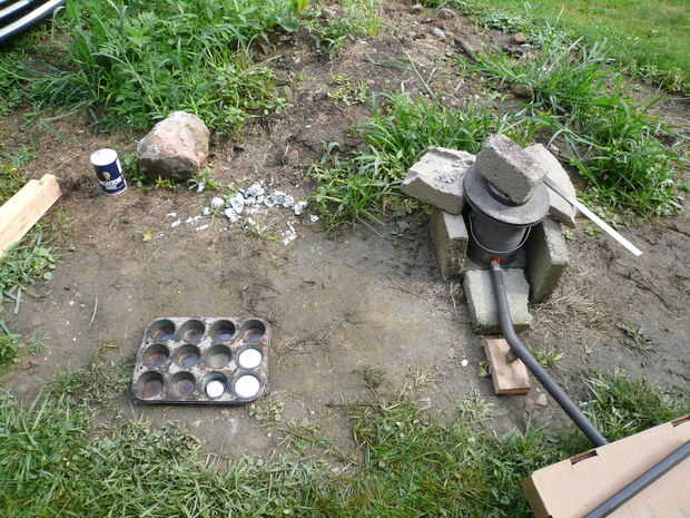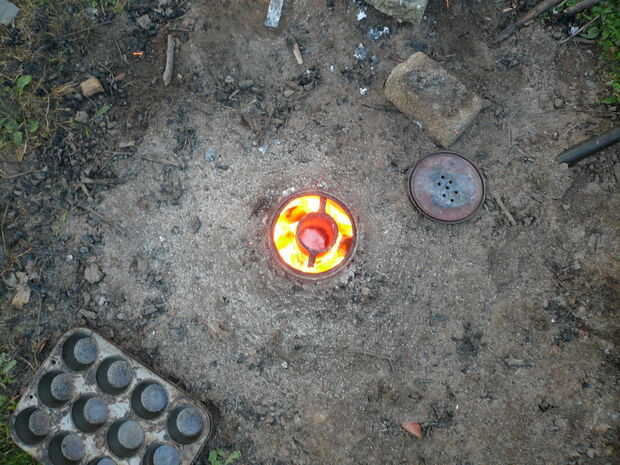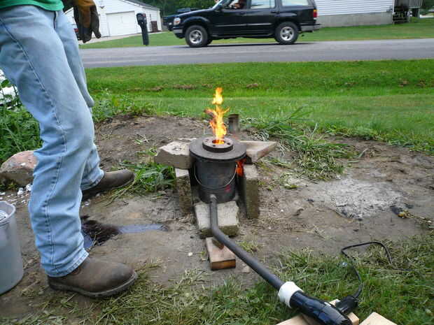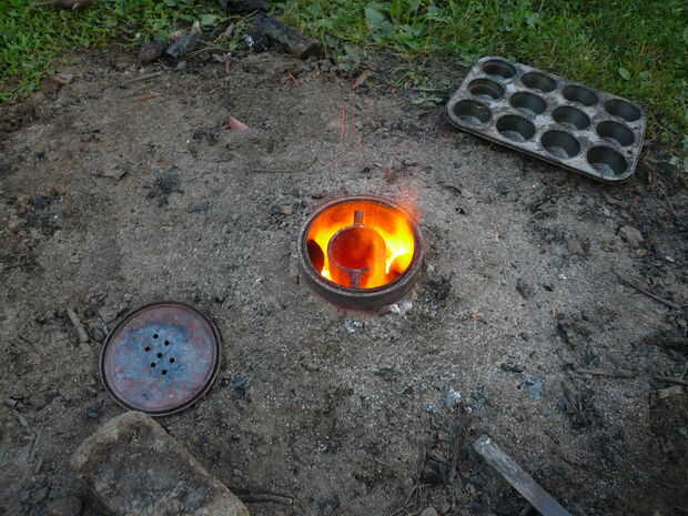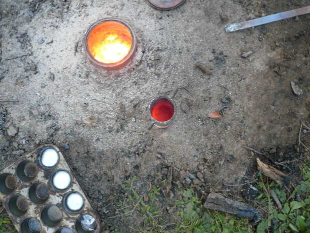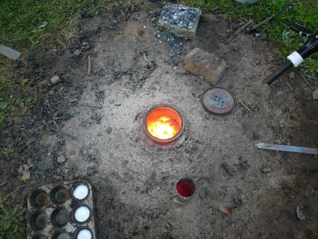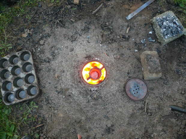 La idea básica es colocar el crisol en la lata de pintura y después llenar la lata con carbón de leña. Encienda el carbón de leña y deje que se ponga en marcha, luego encienda el soplador para que las cosas bonitas y calientes. Utilicé una pintura puede tapa con siete 1/4" agujeros perforados en la parte superior para mantener el calor en la lata de pintura, mientras que el crisol se calienta. También encontré que realmente enterrar la lata en el suelo ayuda a mantener el calor. El crisol debe obtener rojo caliente, que tomó unos 15 minutos y unas cuantas recargas carbón. Luego comenzar a poner las latas en el crisol, cerca de tres a la vez. Que derretir y luego limpie la escoria en el crisol. La escoria es el metal oxidado no deseado y la tinta usada en las latas. Usé una 1 "x 1/8" pieza de acero de unos 3 pies de largo para sacar la escoria. Latas de aluminio producen una gran cantidad de escoria así que tuve que limpiar mucho. Derramé la sal de mesa estándar en el crisol que he leído ayuda a separar la escoria de aluminio y hace más fácil verter el metal. Una vez que derrita todas las latas que derramé el aluminio en la bandeja de la torta de la taza, dejan enfriar unos 30 minutos y fue hecho.