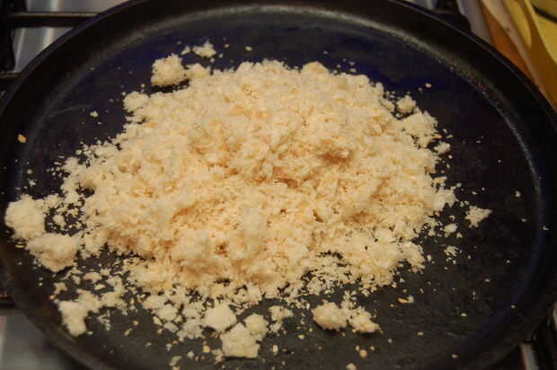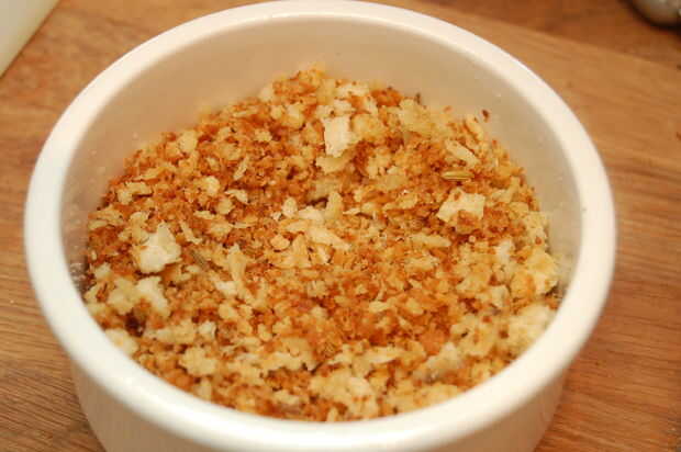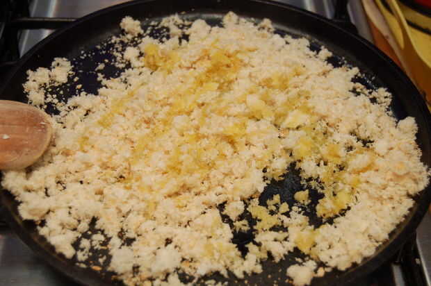 Calentar una sartén de hierro o sartén de base gruesa y tostar las migas de pan en el aceite de oliva hasta que estén doradas. Justo antes de retirar del fuego Agregue las semillas de hinojo y tostar ligeramente. Poner las migas en un plato y ponga a un lado.
